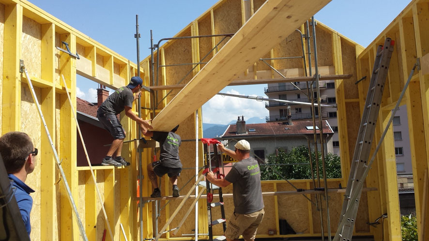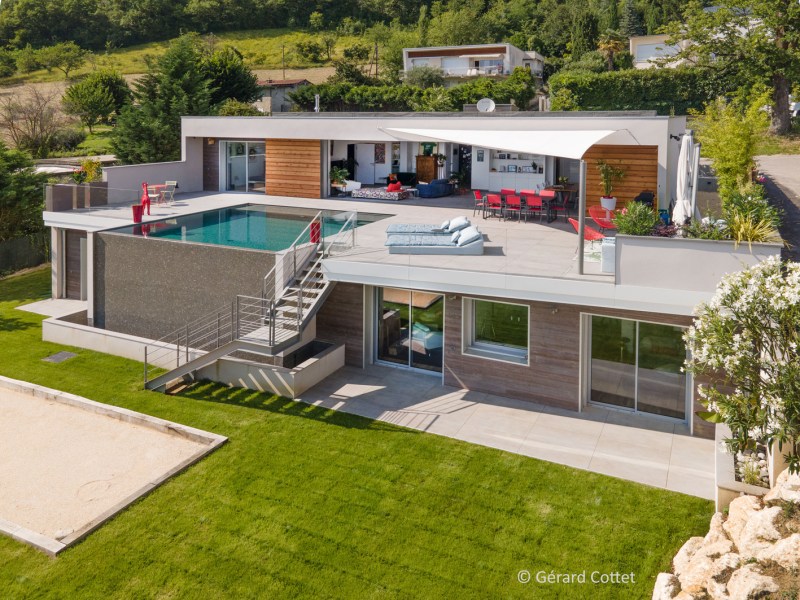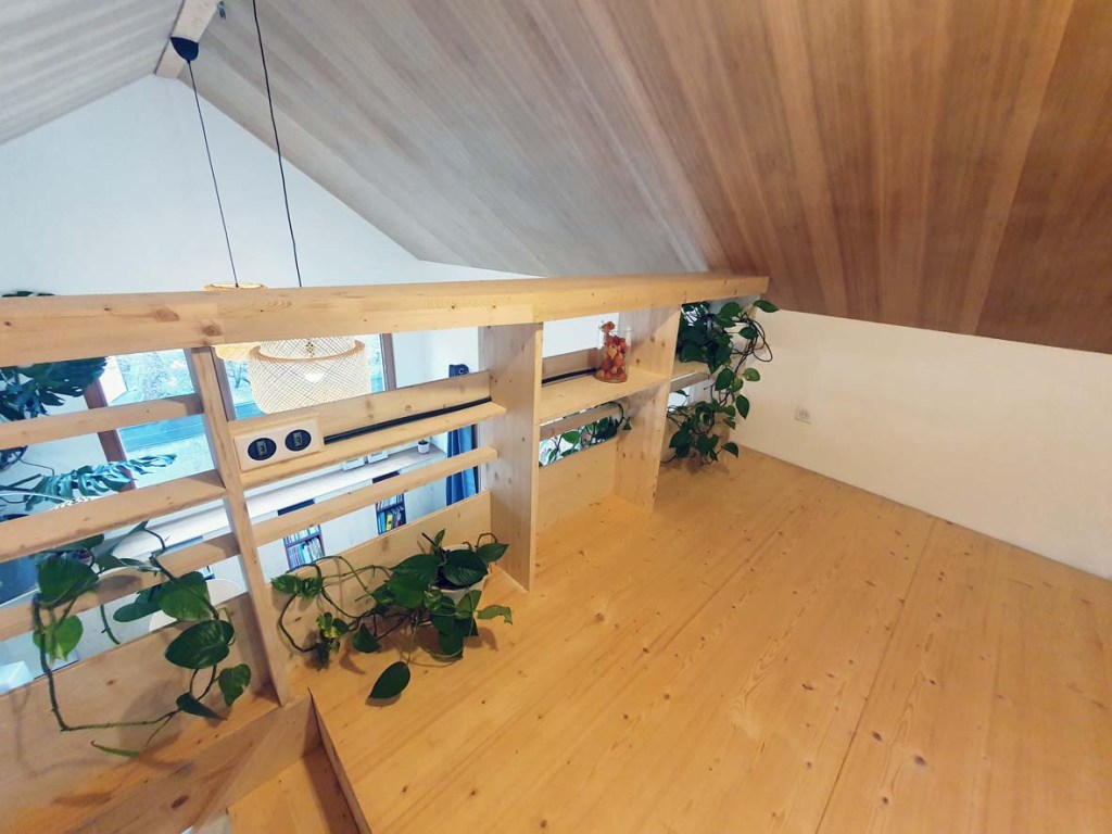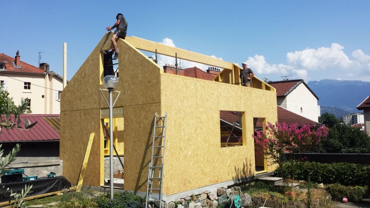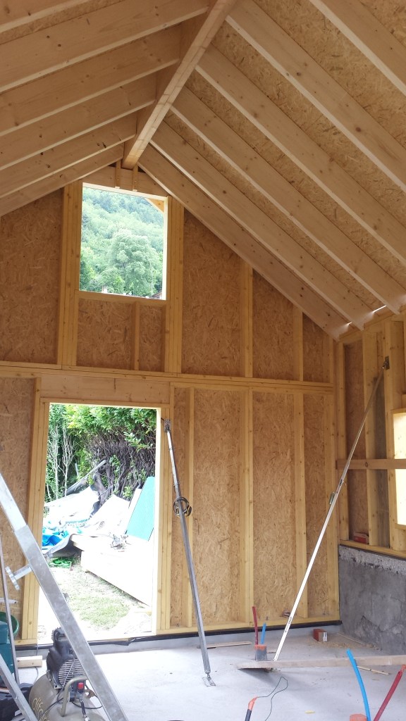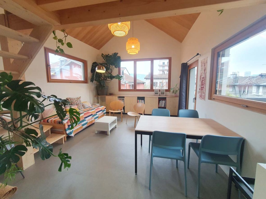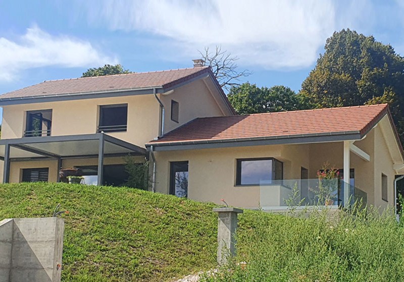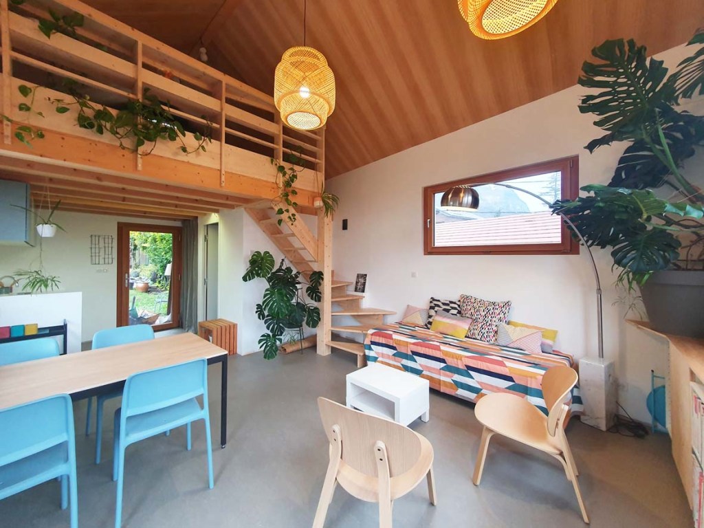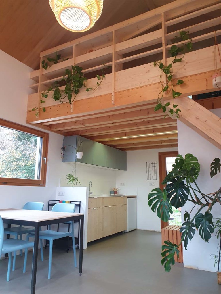 Projet de surélévation d’un garage et de construction d’un studio – atelier en ossature bois. Conçue selon des principes bioclimatiques, cette structure bénéficie d’une isolation renforcée, de fenêtres triple vitrage et d’une ventilation double flux, assurant ainsi une très faible consommation énergétique. La majorité des matériaux utilisés sont biosourcés, incluant la structure et les aménagements intérieurs en bois, les isolants en laine de bois et en métisse (fibres de vêtements recyclés), ainsi que le revêtement de sol en linoléum. De plus, une démarche écologique a été adoptée tout au long du chantier, où la plupart des chutes et déchets ont été valorisés pour une réutilisation ultérieure, minimisant ainsi l’impact environnemental de la construction. Par la suite, des panneaux solaires photovoltaïques ont été installés pour répondre aux besoins énergétiques de l’ensemble de l’habitation.