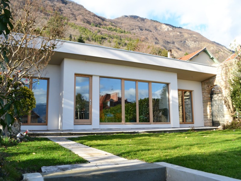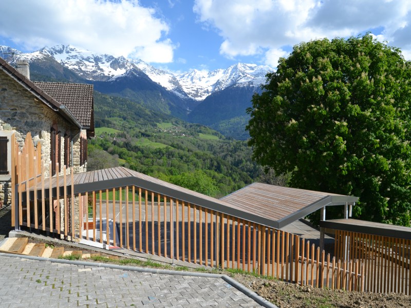La forme du préau s’inspire de la forme des montagnes de Belledonne vues en second plan depuis l’entrée de la mairie.